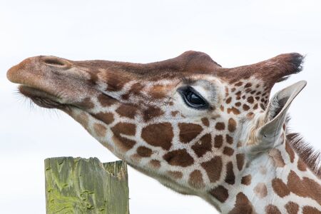 Animal itch. Giraffe scratching its chin on tree stump fence post. Close-up profile of head isolated on white background. Beautiful reticulated giraffe face contemplating philosophy of life perhaps.
