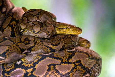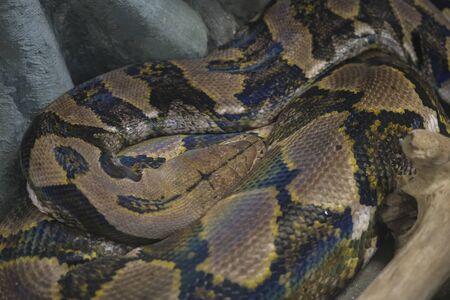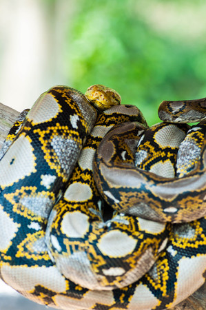 Close up of Reticulated python (Malayopython reticulatus) relaxing in nature at Khaoyai National Park, Thailand