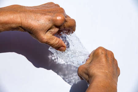 Senior woman's hand squashing used plastic bottle, Water drops on transparent soft drink , White background, Light & Shadow, Close up shot, Environment, Global warming, Recycle concept