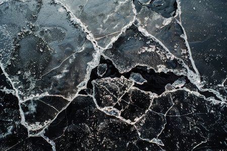 Detailed macro shot of a cracked asphalt road, highlighting rough textures and deep fissures with subtle light reflections on the uneven surface.