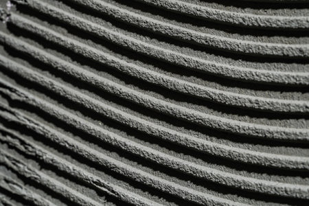 Pattern of notched trowel strokes on the gray surface of cement putty for laying ceramic tiles. Texture of glue paste with strokes and stripes. Macro shot of a wall surface with cement.
