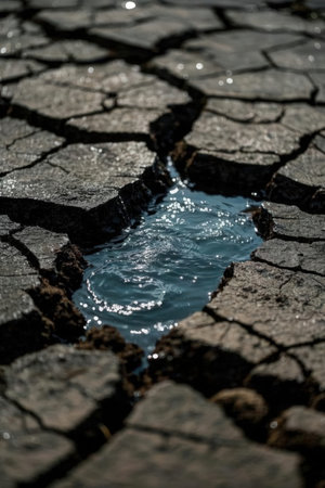 Close-up view of cracked dry soil illustrating severe drought effects. The intricate textures and patterns reflect a pressing environmental issue, highlighting the need for water management.
