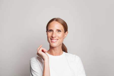 female closeup portrait, caucasian red-haired cute young woman with freckles and green eyes looks into the frame and cute smiling