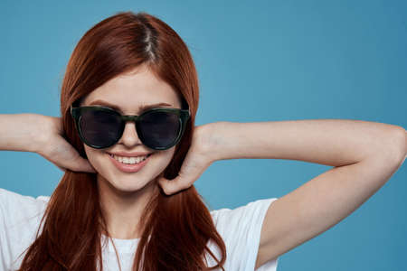 Pretty woman in sunglasses charm long hair white t-shirt blue background