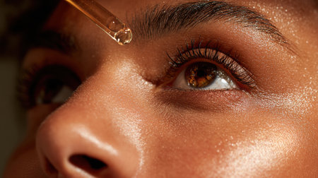 Serum drops are applied to a radiant forehead, highlighting skin texture and creating a modern, luminous look that emphasizes wellness and beauty.