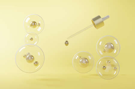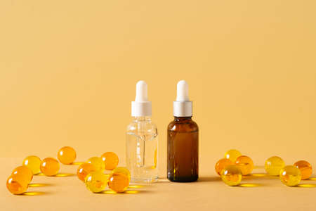 Serum in bottle and sphere ball capsule on yellow background, wellness and cosmetic theme
