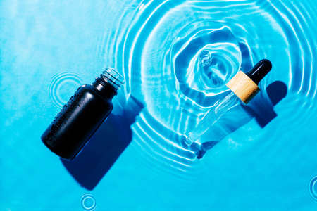 Cosmetic pipette on a blue background with water shadows, underwater effect. Stylish concept of organic essences, sea health products. Copy space, minimalism, flat lay. Marine cosmetics.