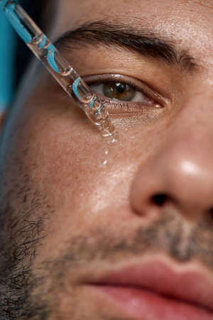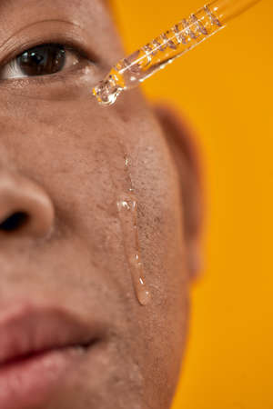 Closeup portrait of handsome guy with smooth skin looking at camera, applying serum beauty product on his face using glass pipette