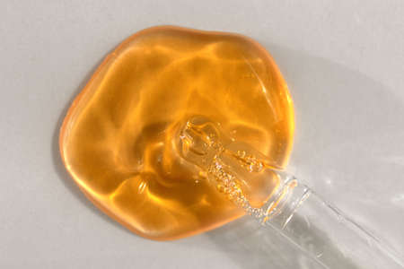 The texture of serum or oil with a pipette on a grey background.