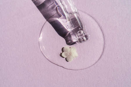 Open cap with close-up dropper pipette with serum drop. Purple background with daylight and the appearance of the texture of the gel. Skin care products. Beauty concept for face and body care