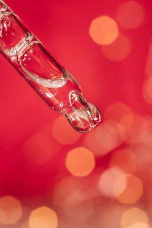 Pipette with serum on a red holiday background with bokeh.