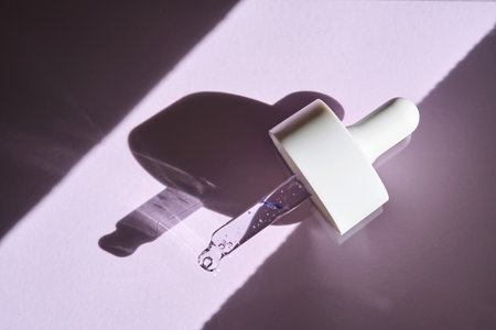 close up of pipette with pouring liquid serum and shadows on purple background with a bottle