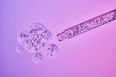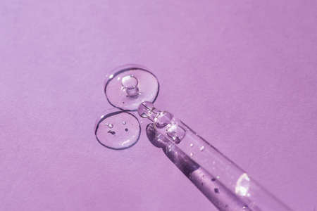 Dropper pipette with serum or cosmetic liquid i on purple in a transparent container on purple background. Transparent container with liquid and bubbles. The appearance of the texture of the gel.