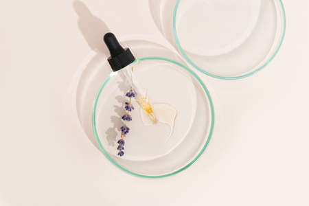 Pipette from dropper with essential oil lies in the petri dish with cosmetics serum. Top view liquid cosmetic. Herbs natural ingredients.