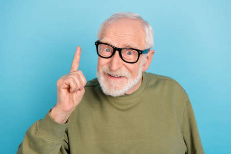 Portrait of attractive cheerful grey-haired man professor teacher pointing up isolated over bright blue color background
