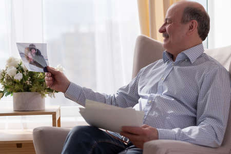 Elderly caucasian man holding vintage photograph at home, reflecting on warm memories. concept of nostalgia, heritage, emotional connection to the past.
