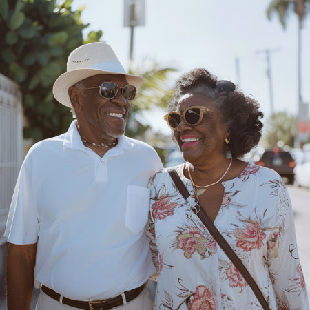 Joyful elderly couple walking together on a sunny street, enjoying their day in a vibrant neighborhood