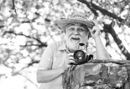 Summer relaxation. photographer man take sakura blossom photo. Cherry blossoming garden. photographer taking photo of apricot bloom. spring season with pink flower. old man watch young plants