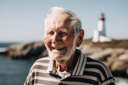 Portrait of a smiling senior man standing in front of a lighthouse