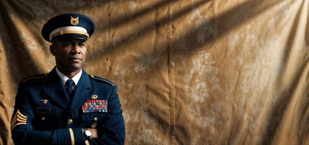 Serious military officer stands with arms crossed in front of a mottled brown banner.