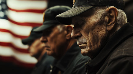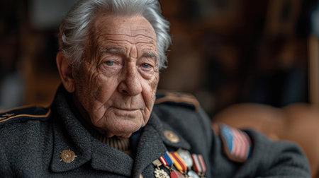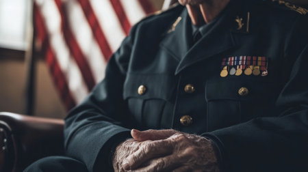 Portrait of a veteran in uniform, adorned with medals, sitting thoughtfully with the US flag nearby, Veterans, Memorial or Independence Day.