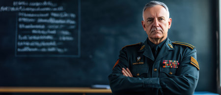 A military officer with medals crosses his arms in a classroom showcasing authority and discipline against a blackboard backdrop.