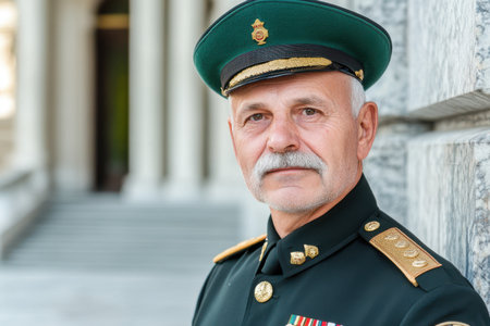 Portrait of stern senior officer in green ceremonial uniform outdoors. AI-generated.