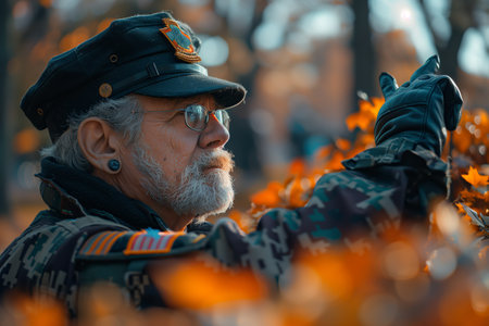 Elderly veteran examines fallen leaves in a vibrant autumn park, surrounded by colorful foliage during the late afternoon