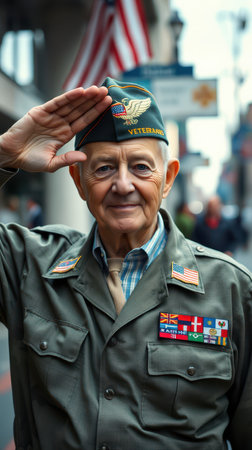 Elderly veteran saluting respectfully on a busy city street with flags in the background during the annual remembrance event
