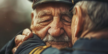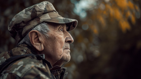 Elderly veteran with a contemplative gaze, evening sun backlighting.