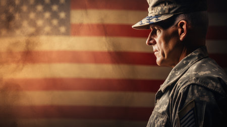 Close-up of a veteran wearing a camouflage uniform and American flag, symbolizing patriotism, military service, and sacrifice
