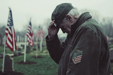 Elderly veteran salutes with pride as he honors his country, standing in front of a waving national flag, evoking deep emotions of patriotism and remembrance.