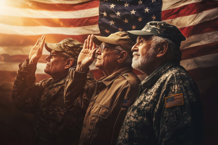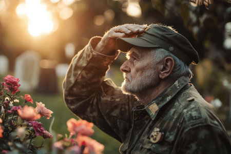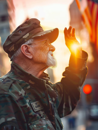 A weathered veteran dressed in military fatigues stands tall, hand raised in a solemn salute as the sun's warm glow illuminates his face, reflecting the dignity and sacrifice of those who have served