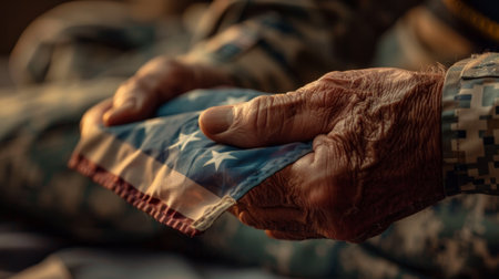 Close up of elderly hands holding a folded American flag. The image evokes a sense of respect, honor, and remembrance.