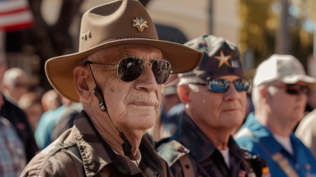Two senior Caucasian men wearing hats and sunglasses at a public event. One man has a mustache and is dressed in military attire. The background is blurred with a crowd.