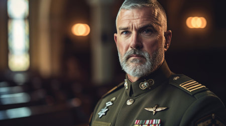 The picture of the military officer standing inside the church and working as the priest with blur background, the priest require Counseling skill, Communication skill, Theological Knowledge. AIG43.