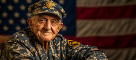 A close-up of a veteran in uniform with medals, seated in front of an American flag. Symbol of military service