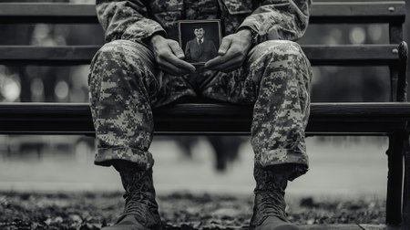 American Veteran Reflecting on Park Bench Holding Photo. Concept of Military Service, Veteran Remembrance, Nostalgia, Honoring Veterans.