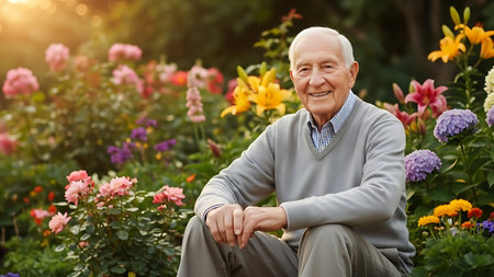 An elderly man with a cheerful smile stands amidst a field of bright wildflowers under a clear blue sky. The sun shines gently, illuminating the flowers and creating a serene atmosphere.