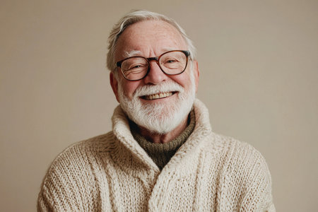 Portrait of smiling mature man with gray beard wearing glasses and cozy turtleneck sweater on neutral background. High quality photo