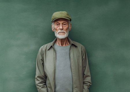 The image features a senior man posing in gray attire, set against a minimalist background with rounded shapes in light green, dark gray, and light brown. This subtle and balanced composition reflects a sense of calm and wisdom, blending the subject's poise with the simplicity and elegance of the background's color palette.