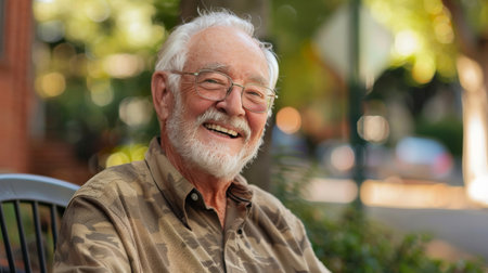 A senior man with gray hair smiles warmly, seated in a lush green park on a sunny afternoon. The peaceful atmosphere invites a sense of tranquility and joy.