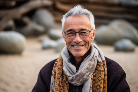 Portrait of smiling senior man wearing scarf and glasses on the beach