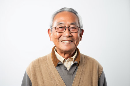 Senior Japanese man with glasses, smiling kindly, showing his wisdom and friendly demeanor, standing against a calm sky-blue background, evoking feelings of serenity.