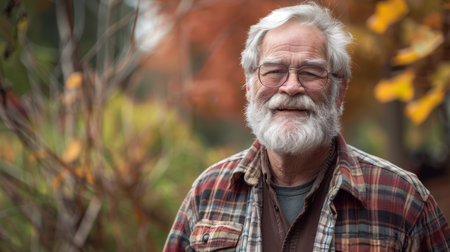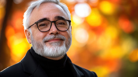 A gentleman with gray hair and glasses enjoys the vibrant colors of fall while standing outside in the park.