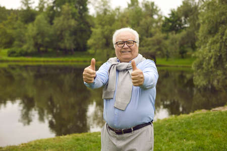 Happy European senior citizen doing like gesture. Cheerful white haired retired old Caucasian man in glasses and shirt standing in green summer park, giving thumbs up, smiling and looking at camera