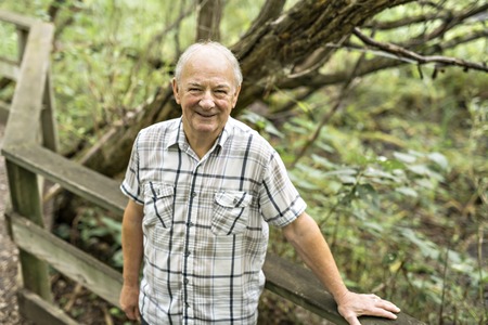 Old man smiling, exploring nature during forest vacation, mindfulness retreat for digital detox, escaping city life to cure burnout and depression with forest therapy