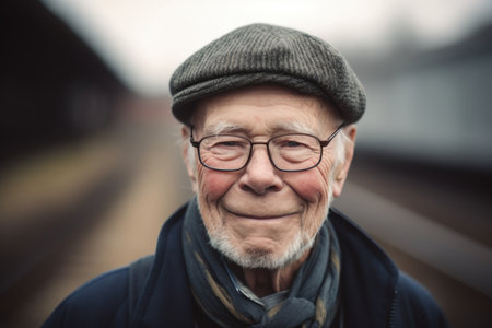 Portrait of an elderly man in a cap and glasses on the railway station.