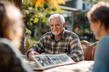 Senior man sharing memories with family, looking at old photographs in a photo album, sitting at a table in the garden