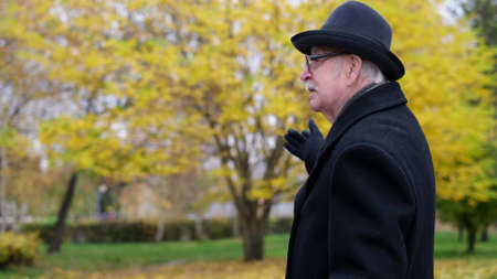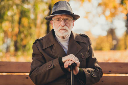 Wish you were here. Photo of old white haired grandpa husband street walk lonely sit bench with stick sad miss wife wear glasses jacket cap autumn city central park outside